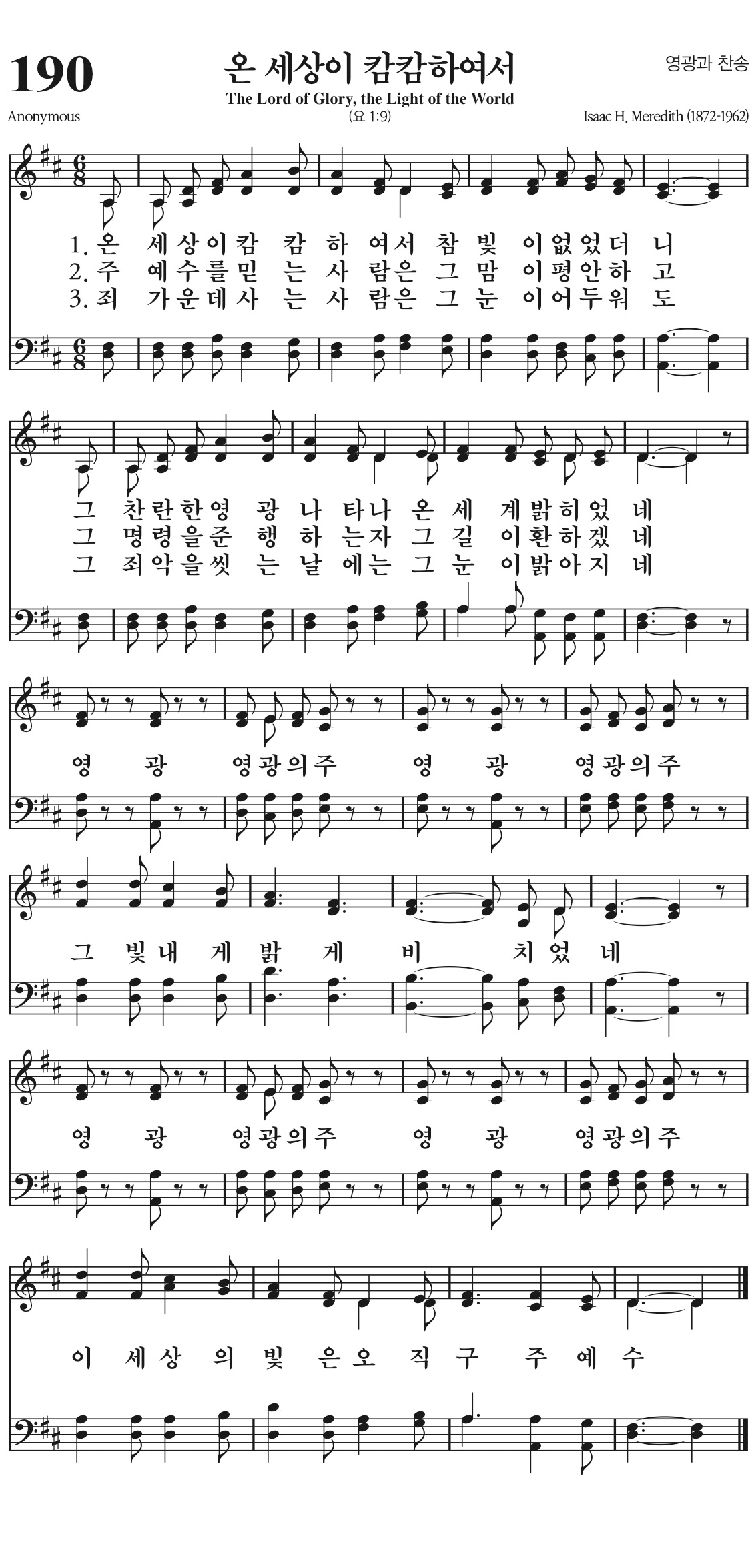그 찬란한 영광 나타나 온 세계 밝히었네